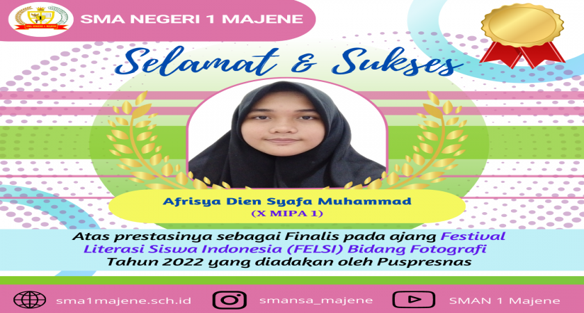 Kabar gembira datang dari ajang Festival Literasi Siswa Indonesia (FELSI) 2022, salah satu siswa SMA Negeri 1 Majene lolos sebagai finalis FELSI 2022 Bidang Fotografi atas nama Afrisya Dien Syafa Muhammad (X MIPA 1). FELSI merupakan salah satu ajang yang diadakan oleh Pusat Prestasi Nasional (Puspresnas) dengan tiga bidang literasi yang dilombakan, yaitu Jurnalistik (Artikel Feature), Cerita Pendek, dan Fotografi. Tema FELSI 2022 adalah “Pulih Bersama, Bangkit Perkasa” yang diadaptasi dari semangat “G20” dan melalui tema tersebut diharapkan siswa mampu membawa optimisme untuk masa depan Indonesia melalui karya-karya literasi.