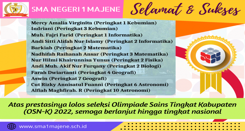 Kabar gembira kembali datang dari ajang Olimpiade Sains Nasional Tingkat Kabupaten (OSN-K) 2022 yang telah dilaksanakan pada tanggal 23 s.d 25 Mei 2022 lalu secara daring. Sebanyak 12 orang peserta SMA Negeri 1 Majene lolos seleksi OSN-K dan berhak mengikuti tahap selanjutnya di tingkat provinsi.