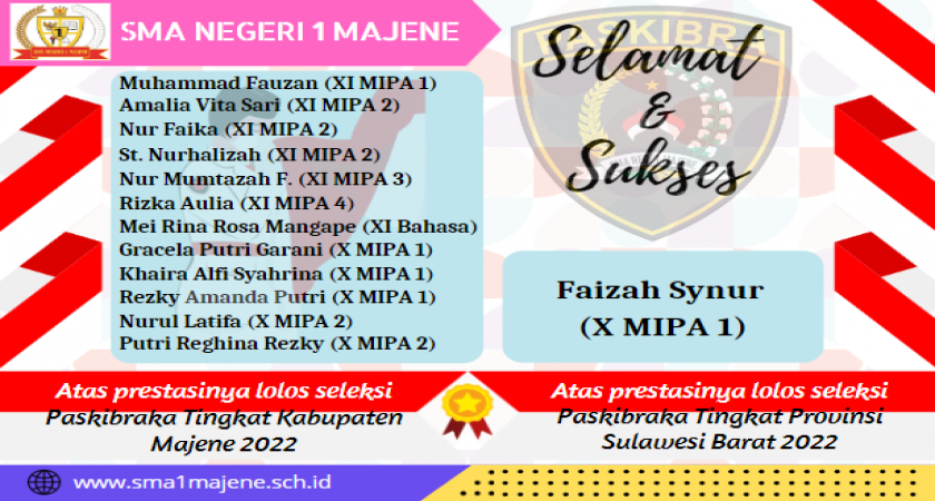 Selanjutnya pada seleksi Paskibraka tingkat kabupaten Majene dilaksanakan sebanyak dua tahap, yaitu tahap 1 pada tanggal 2 s.d 4 Juni 2022 di SMA Negeri 1 Majene dan tahap 2 pada tanggal 16 s.d 17 Juni 2022 di Sport Center Majene. Sebanyak 32 orang lolos pada seleksi tahap 1 namun 3 orang mengundurkan diri. Pada seleksi tahap 2 sebanyak 12 orang siswa SMAN 1 Majene lolos seleksi Paskibraka tingkat Kabupaten Majene.