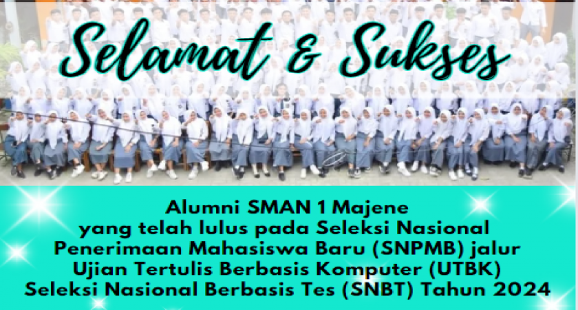 Hasil Seleksi Nasional Penerimaan Mahasiswa Baru (SNPMB) Jalur Seleksi Nasional Berbasis Tes (SNBT) Tahun 2024 telah diumumkan pada hari Kamis (13/06/2024) lalu. Berdasarkan informasi yang diperoleh dari pendataan alumni yang melaporkan kelulusannya, total 41 orang dinyatakan lulus SNBT Tahun 2024 yang terdiri 1 orang di Universitas Brawijaya, 10 orang di Universitas Hasanuddin, 1 orang di Universitas UIN Alauddin Makassar, 1 orang di UIN Maulana Malik Ibrahim Malang, 1 orang di Universitas Negeri Gorontalo, 7 orang di Universitas Negeri Makassar, dan 20 orang di Universitas Sulawesi Barat.