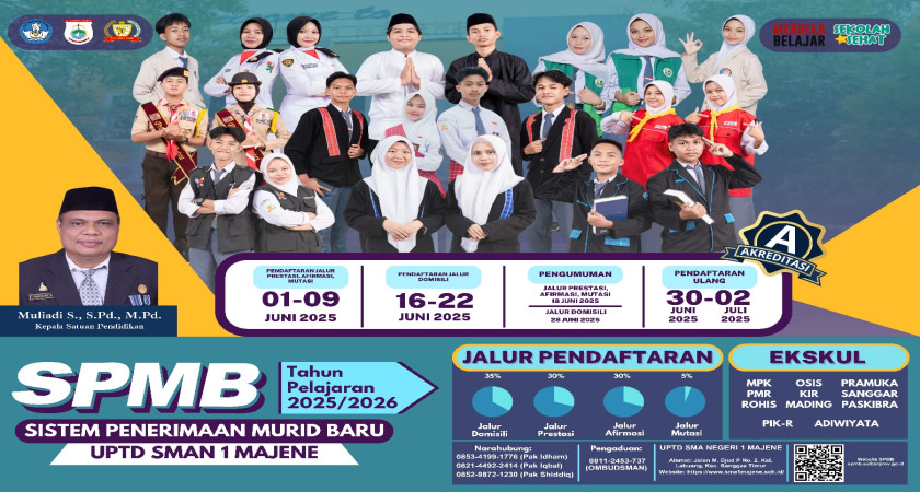 - Pendaftaran secara daring: Calon Murid melakukan pendaftaran secara daring pada portal SPMB. Jika mengalami kendala dapat langsung ke UPTD SMAN 1 Majene untuk dibantu dalam proses pendaftaran.