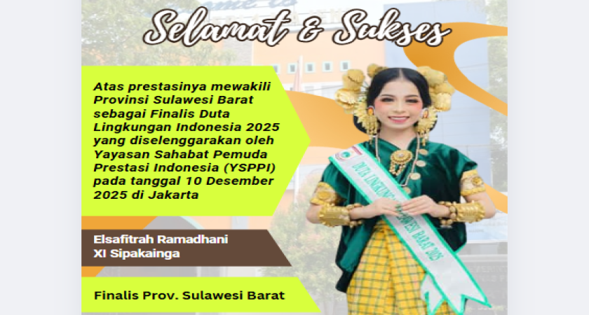 Salah satu siswi UPTD SMAN 1 Majene atas nama Elsafitrah Ramadani (XI Sipakainga) terpilih sebagai Finalis Duta Lingkungan Indonesia 2025 perwakilan Provinsi Sulawesi Barat. Sekolah memberikan apresiasi kepada Elsa pada momen upacara bendera dengan pengalungan selempang.