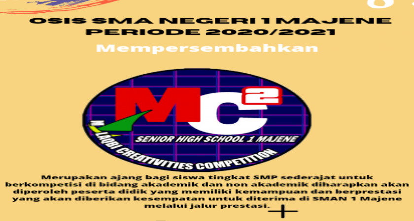 Kali ini OSIS SMA Negeri 1 Majene kembali akan mengadakan Malaqbi Creativites Competition (MC2) yang merupakan ajang bagi siswa kelas IX tingkat SMP/MTS se-Kabupaten Majene-Polewali Mandar untuk berkompetisi di bidang akademik dan non akademik. Ajang ini akan dilaksanakan pada tanggal 25-29 Maret 2021 secara langsung di SMAN 1 Majene dan juga secara daring.